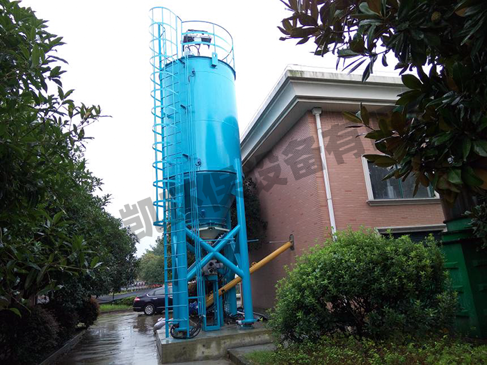 石灰料倉是將一定量的石灰粉劑(通過負壓吸入、物料運輸車吹入、螺旋輸送機輸入、人工倒入)存放在一個特制的容器(石灰料倉)內,粉料入倉時產生的粉塵由布袋收塵器收塵,吸咐在布袋表面的粉塵由振打器激振下落回粉料倉。存儲的石灰經振蕩器疏松均勻下料給變頻調速給料機定量給料(干粉投加過程),螺旋輸送機輸送到石灰乳溶解箱,機械攪拌產生乳液,藥液投加泵將5%-10%的濃度的乳液輸送到藥液投加點的整個過程(乳液投加過程)。